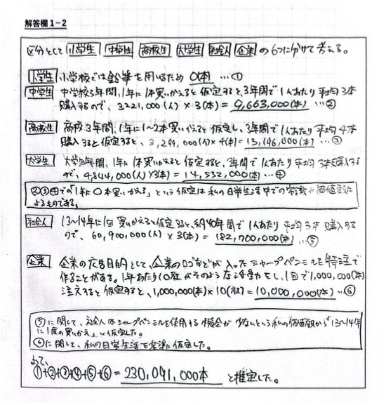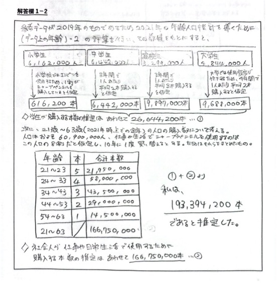 2021年に日本国内で購入されたシャープペンシルの本数を推定しその数値を解答欄1−1に記入してください。